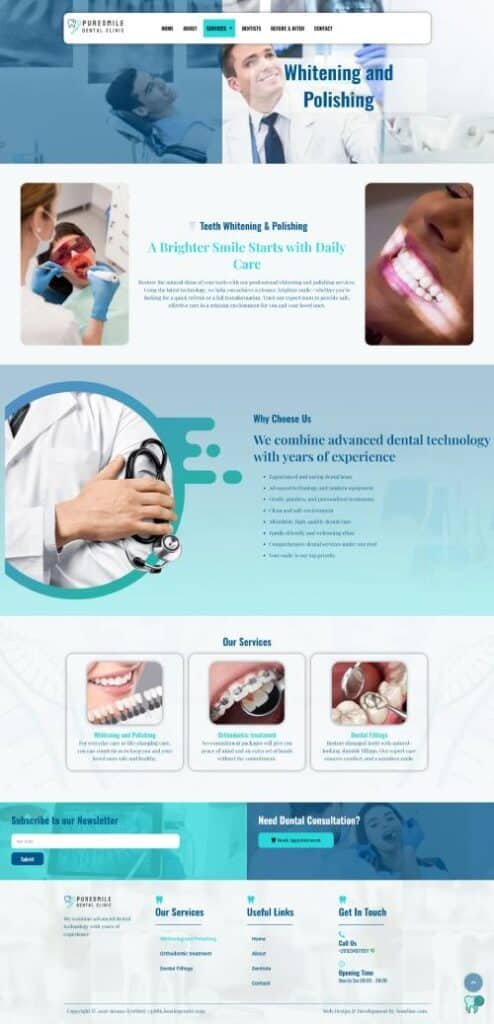 النتيجة النهائية هي موقع إلكتروني متجاوب يركّز على احتياجات المرضى، ويعزّز الهوية الرقمية لمركز PureSmile ويؤكد خبرته ومصداقيته في مجال طب الأسنان.