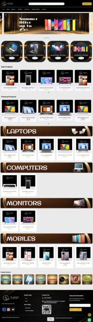 The El Saleh website was designed and developed to present the brand as a reliable destination for laptops, computers, mobile phones, and display screens. The project focused on creating a clean, modern interface that makes product browsing easy and highlights the wide range of technology solutions offered by the store.