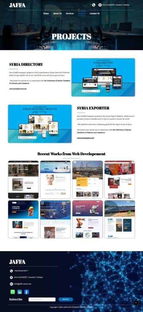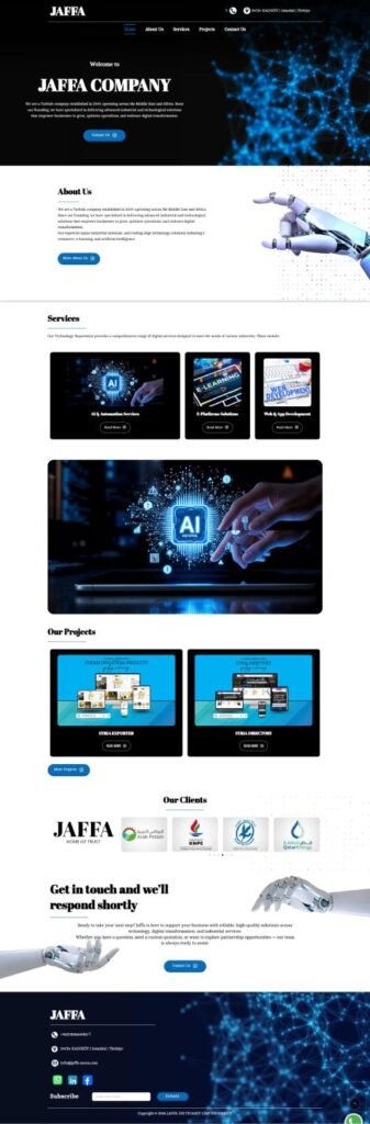 The website structure highlights the company’s diverse expertise, including industrial solutions, e-commerce, e-learning, and artificial intelligence, while maintaining a clear, professional layout that reflects technical excellence and regional market understanding. The result is a scalable and modern website designed to support business growth and showcase innovation.