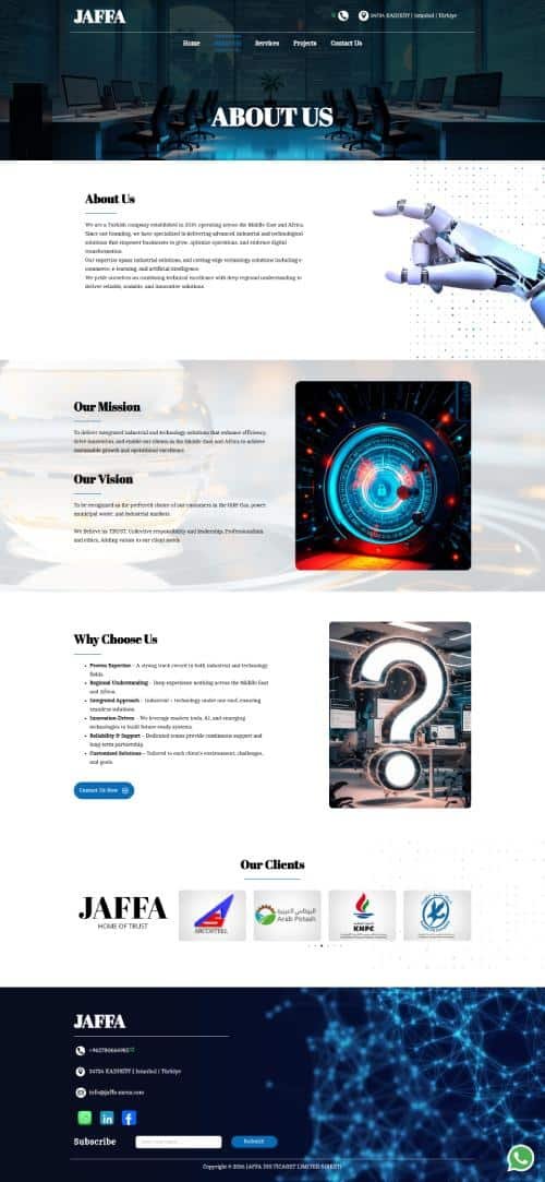 This website was developed for a Turkish-based company established in 2019, operating across the Middle East and Africa. The project focused on presenting the company as a reliable provider of advanced industrial and technological solutions, with a strong emphasis on digital transformation.