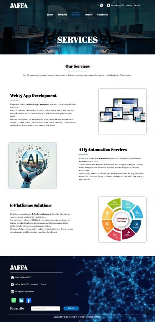 The website structure highlights the company’s diverse expertise, including industrial solutions, e-commerce, e-learning, and artificial intelligence, while maintaining a clear, professional layout that reflects technical excellence and regional market understanding. The result is a scalable and modern website designed to support business growth and showcase innovation.